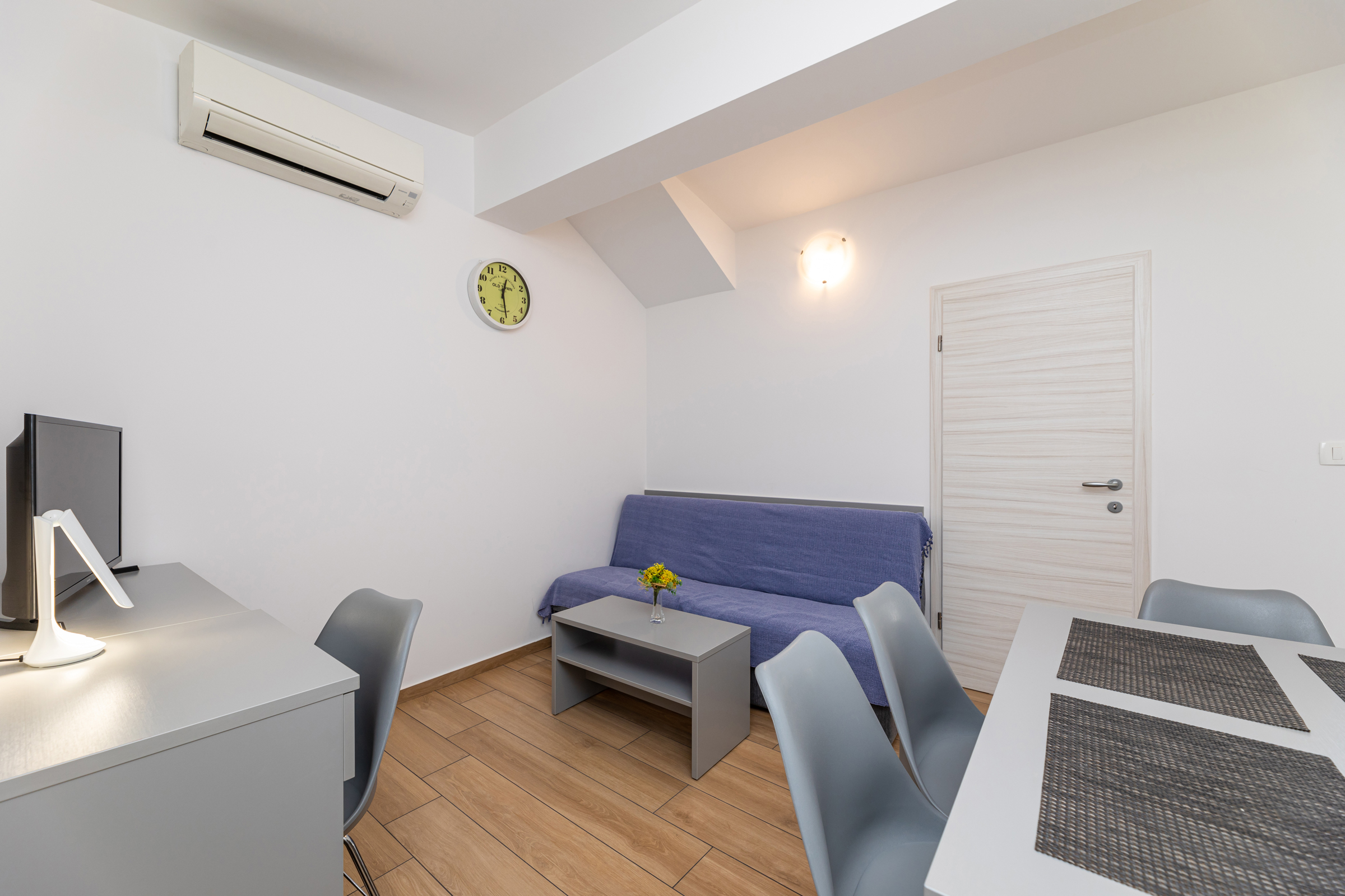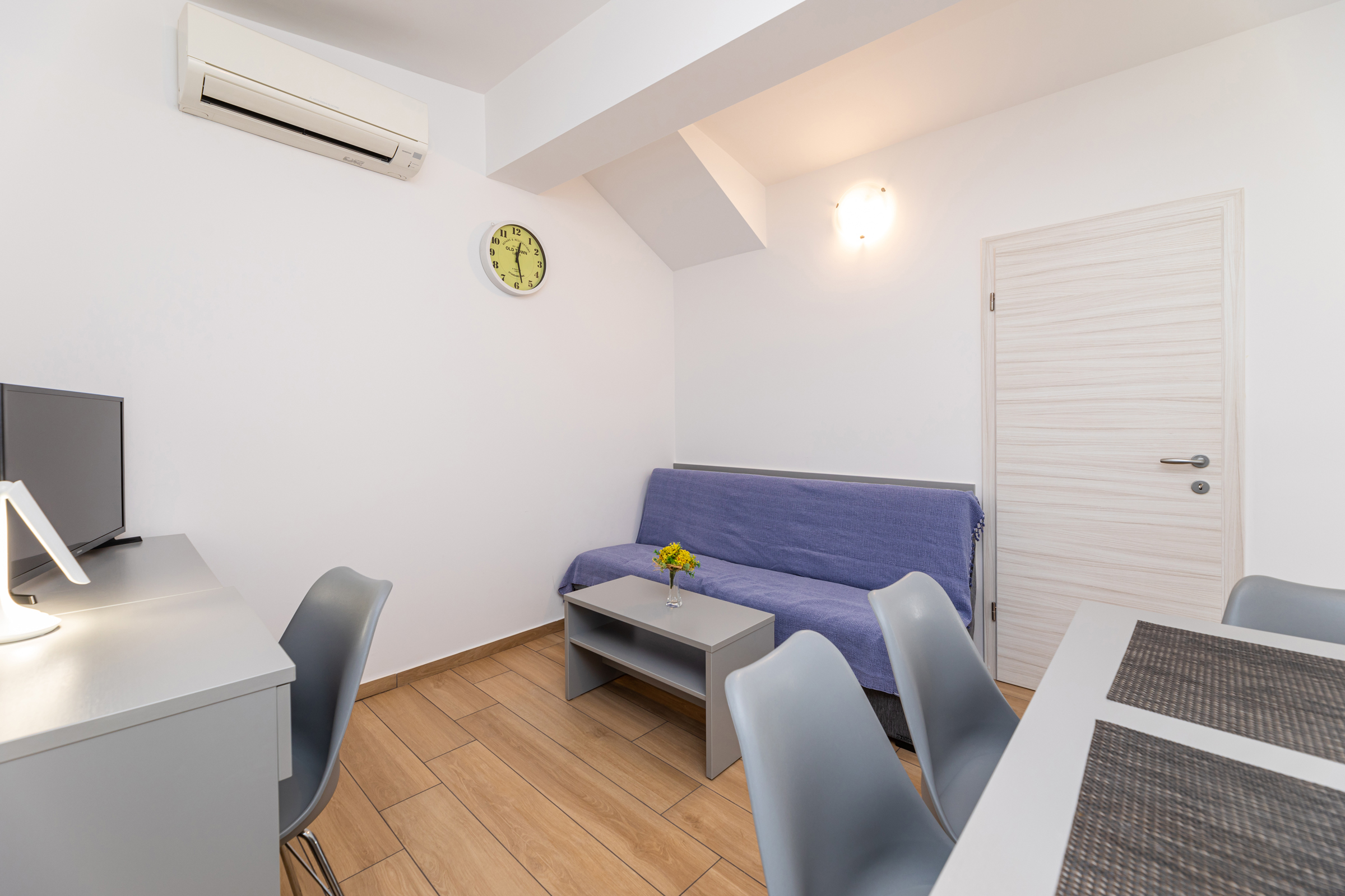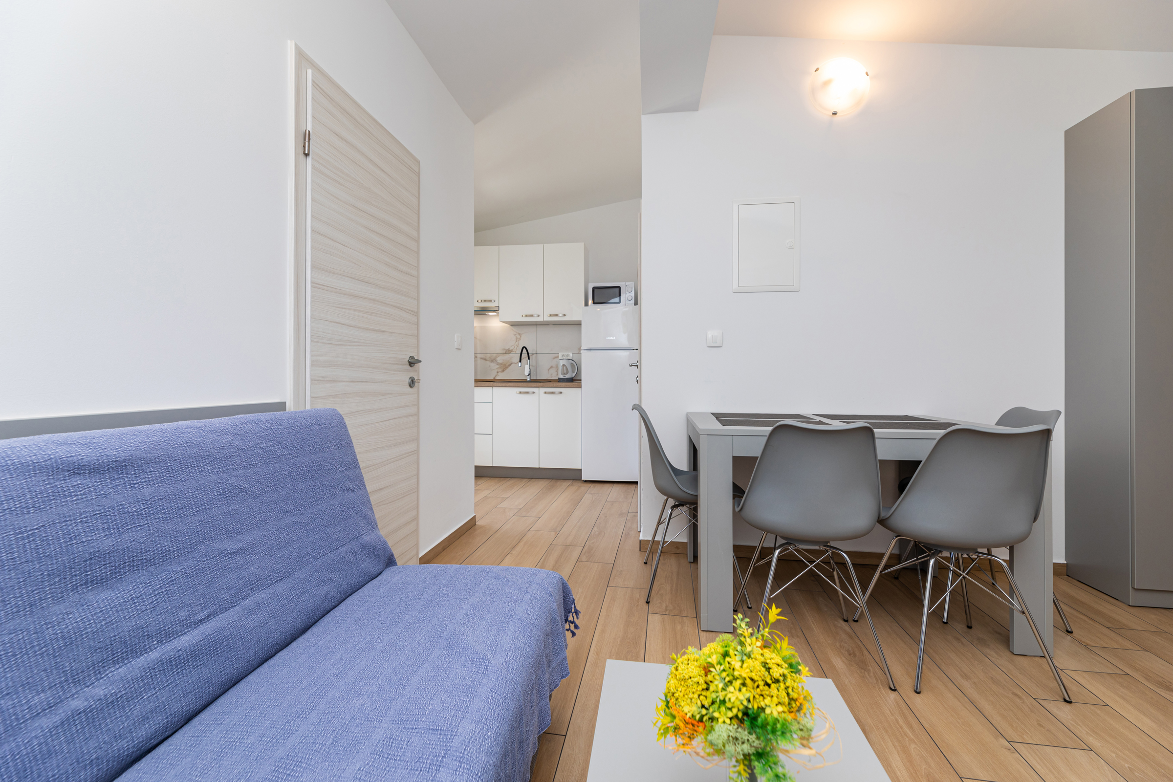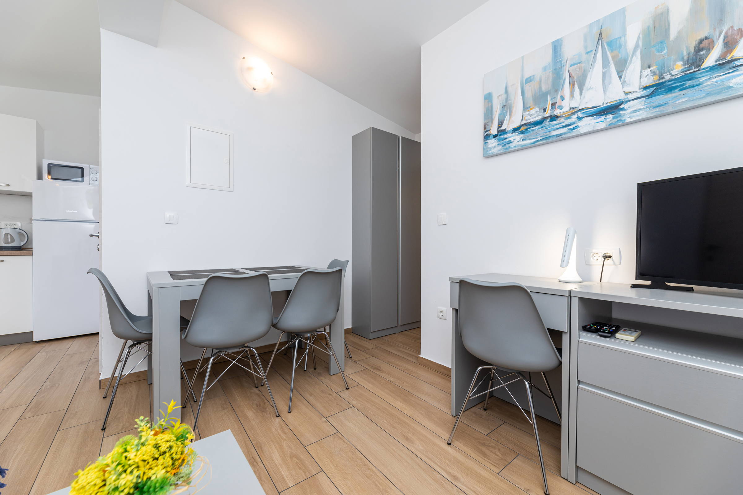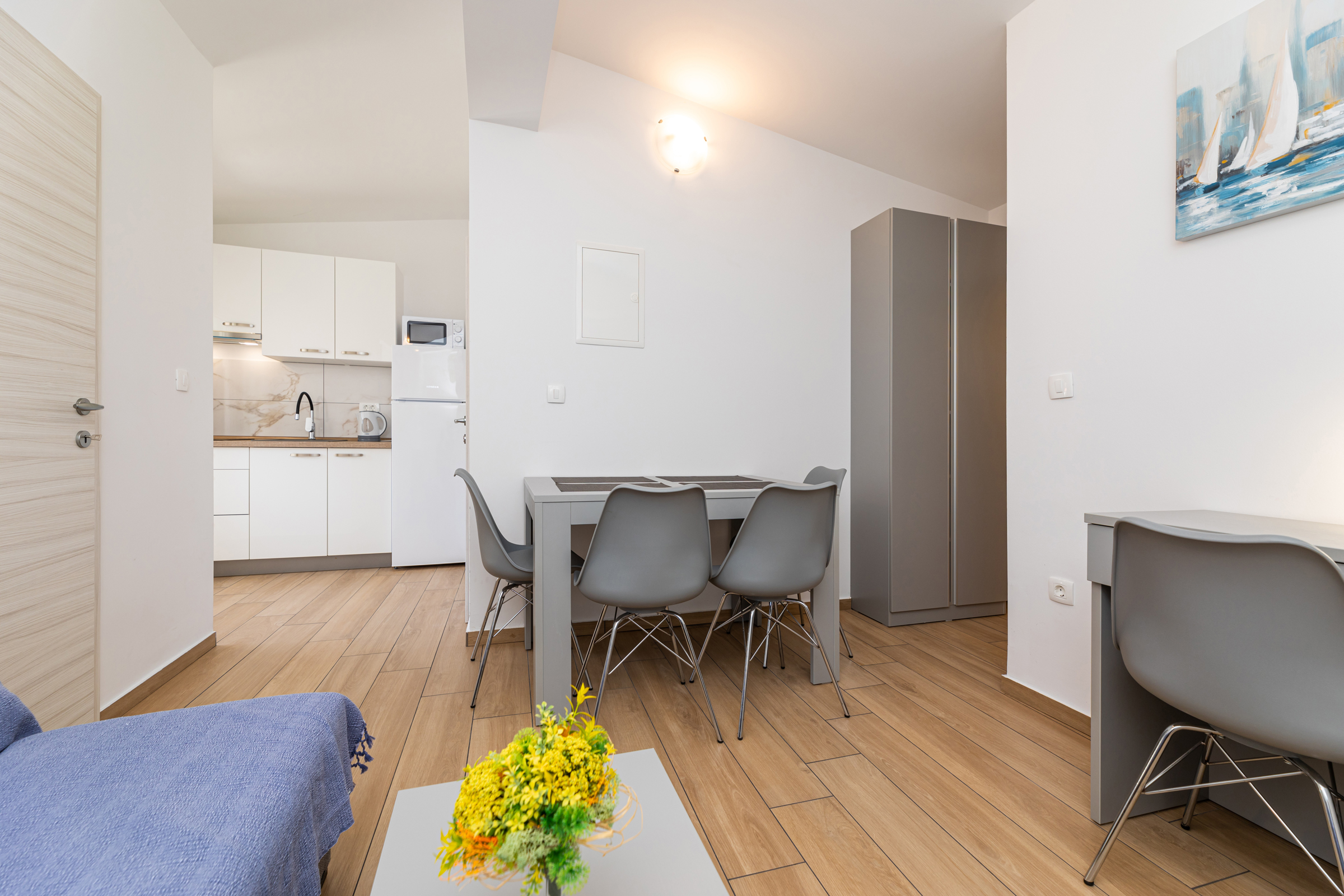 Das Haus verfügt über 8 Apartments und 3 Studios, jeweils mit eigenem Parkplatz. 2 Apartments haben 2 Schlafzimmer und Platz für 4 Erwachsene oder eine Familie mit 2-3 Kindern. 6 Apartments haben 1 Schlafzimmer und Platz für zwei Erwachsene und 1 Kind. 3 Studios sind für maximal 2 Personen geeignet. Die Studios Nr. 5 und 6 haben keinen Balkon, Studio 10 hat eigene Balkon. Alle Apartments verfügen über eine Terrasse oder einen Balkon sowie einen Tisch und Stühle.