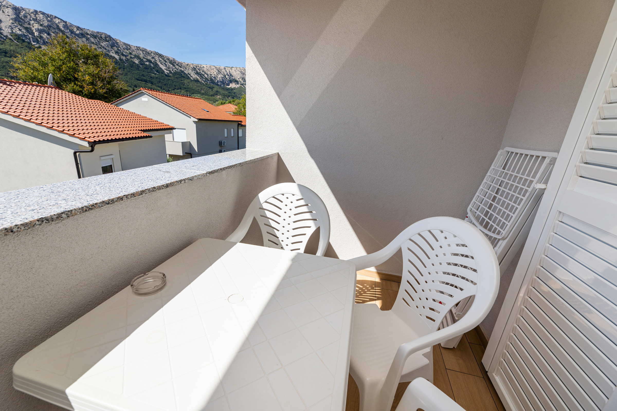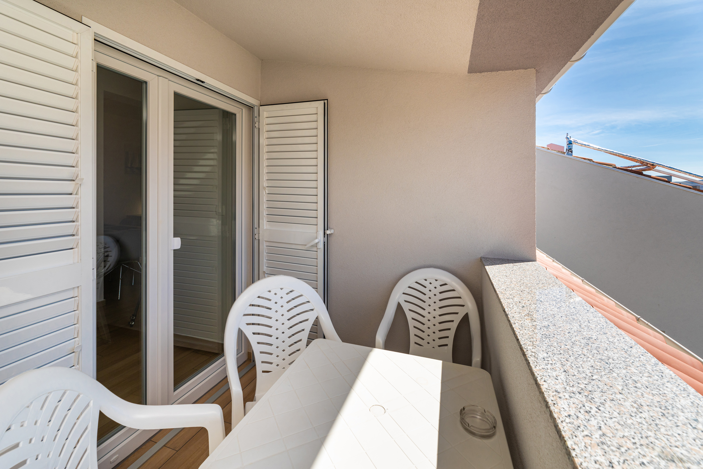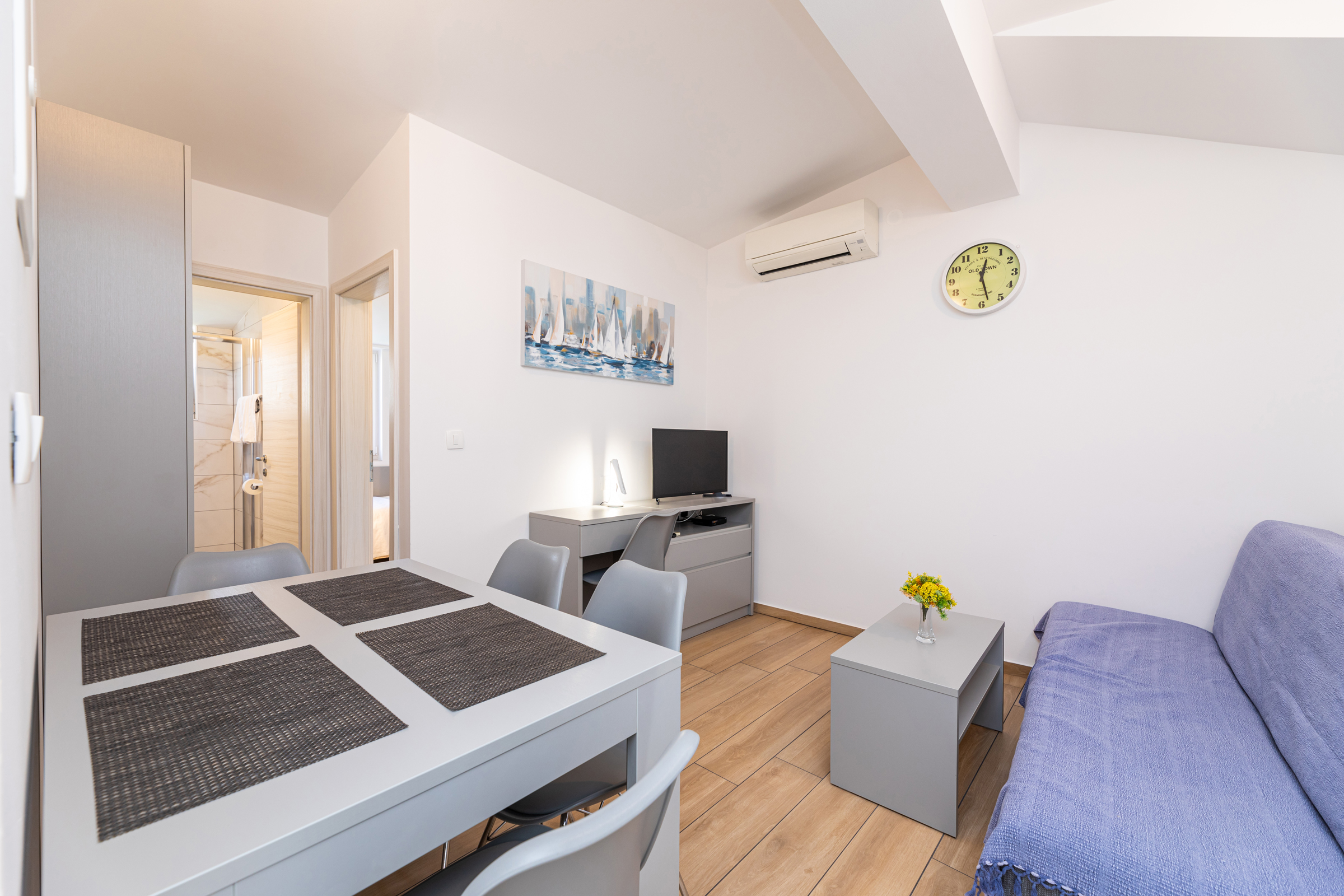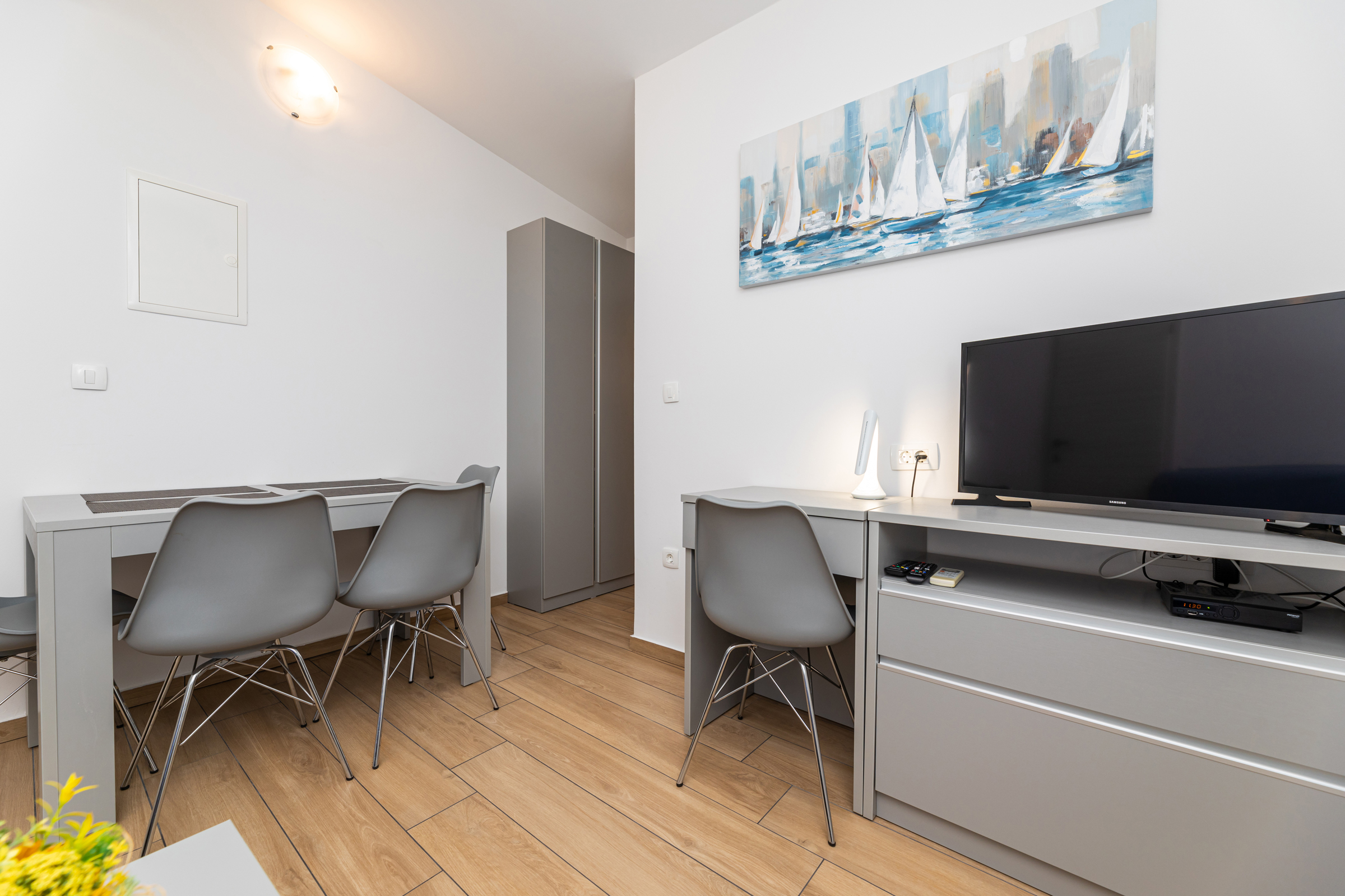 Das Haus verfügt über 8 Apartments und 3 Studios, jeweils mit eigenem Parkplatz. 2 Apartments haben 2 Schlafzimmer und Platz für 4 Erwachsene oder eine Familie mit 2-3 Kindern. 6 Apartments haben 1 Schlafzimmer und Platz für zwei Erwachsene und 1 Kind. 3 Studios sind für maximal 2 Personen geeignet. Die Studios Nr. 5 und 6 haben keinen Balkon, Studio 10 hat eigene Balkon. Alle Apartments verfügen über eine Terrasse oder einen Balkon sowie einen Tisch und Stühle.