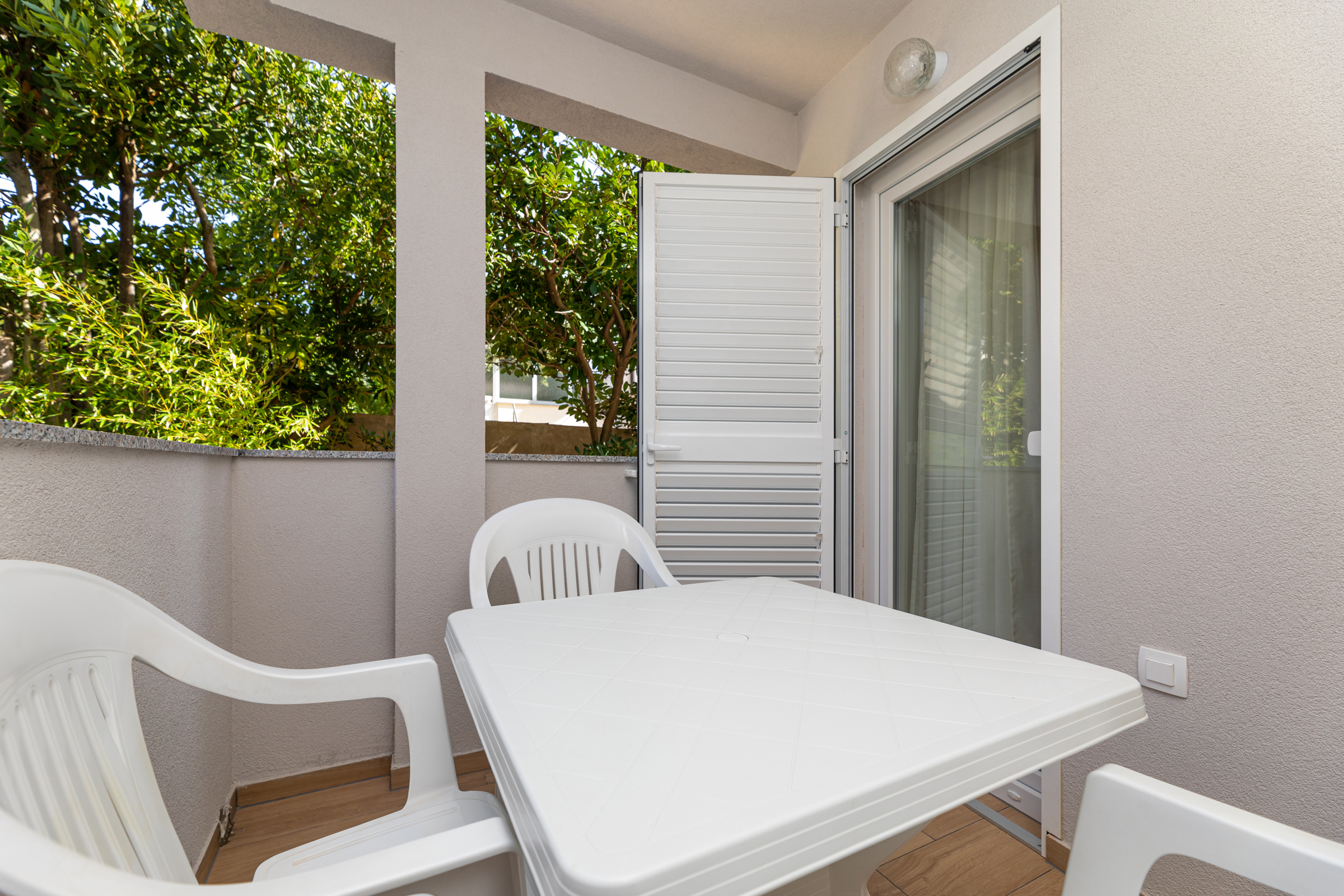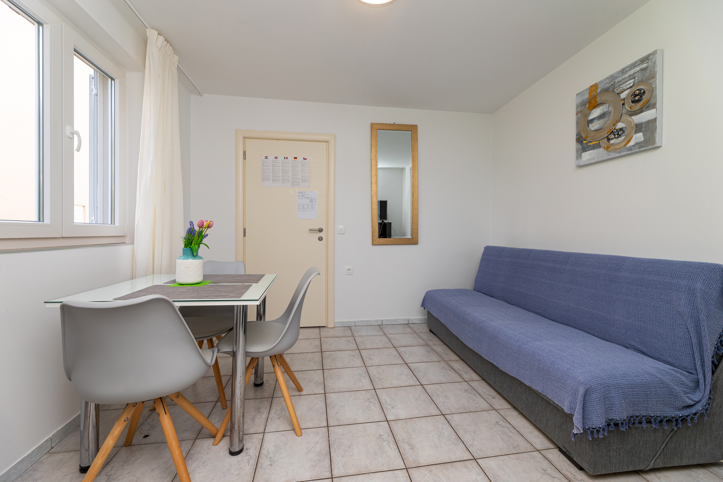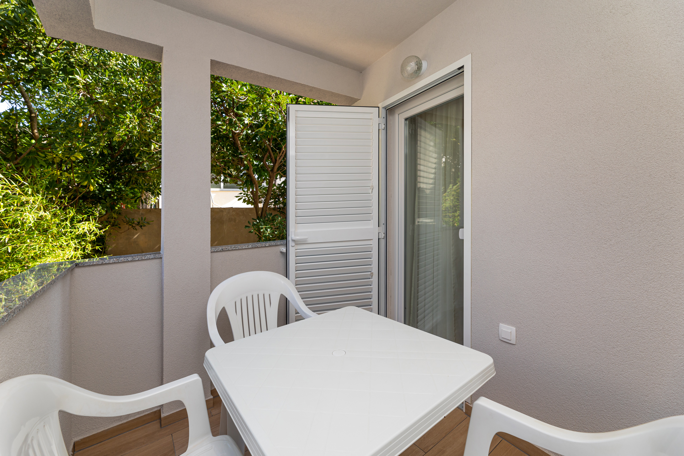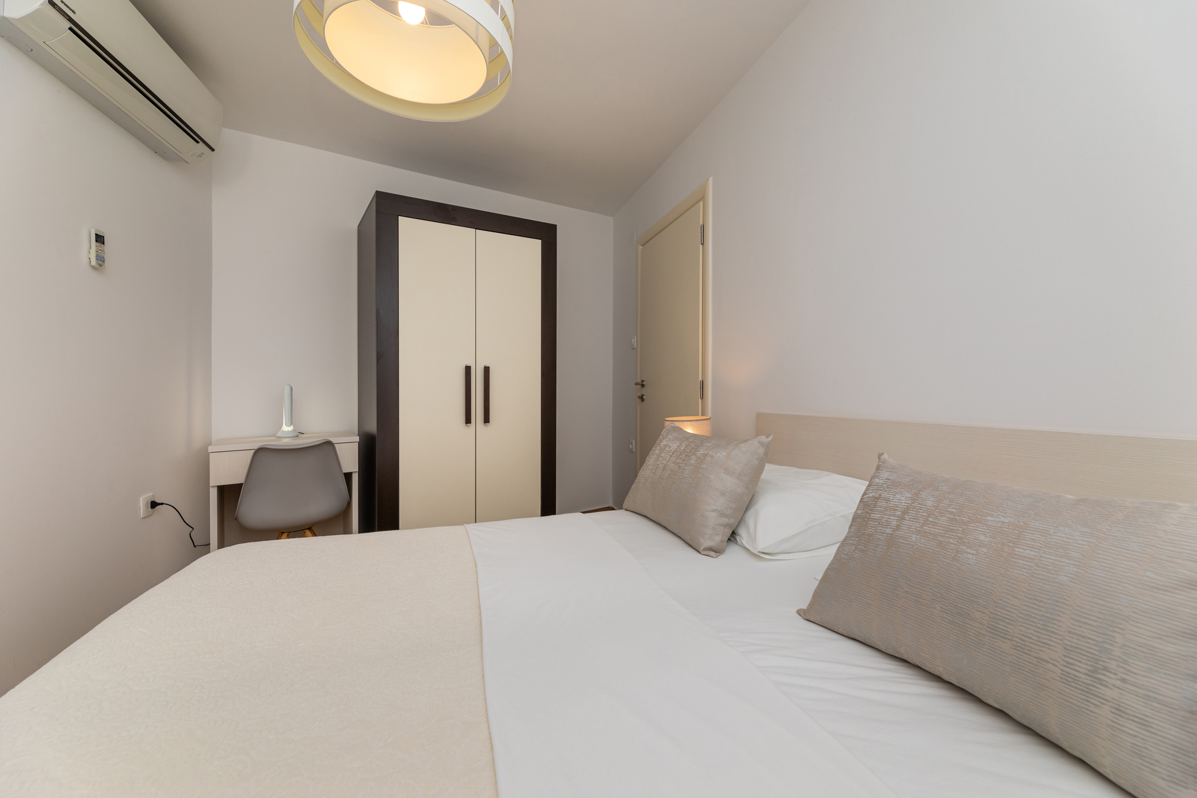 Das Haus verfügt über 8 Apartments und 3 Studios, jeweils mit eigenem Parkplatz. 2 Apartments haben 2 Schlafzimmer und Platz für 4 Erwachsene oder eine Familie mit 2-3 Kindern. 6 Apartments haben 1 Schlafzimmer und Platz für zwei Erwachsene und 1 Kind. 3 Studios sind für maximal 2 Personen geeignet. Die Studios Nr. 5 und 6 haben keinen Balkon, Studio 10 hat eigene Balkon. Alle Apartments verfügen über eine Terrasse oder einen Balkon sowie einen Tisch und Stühle.
