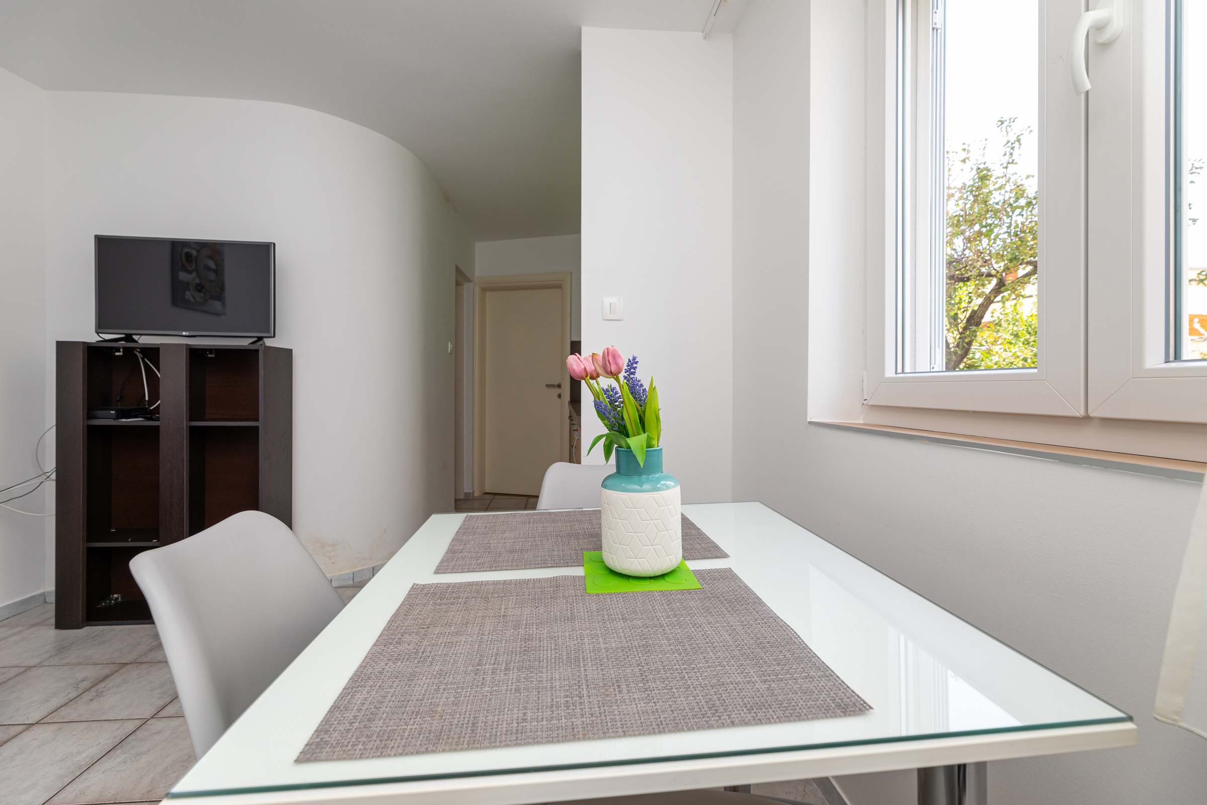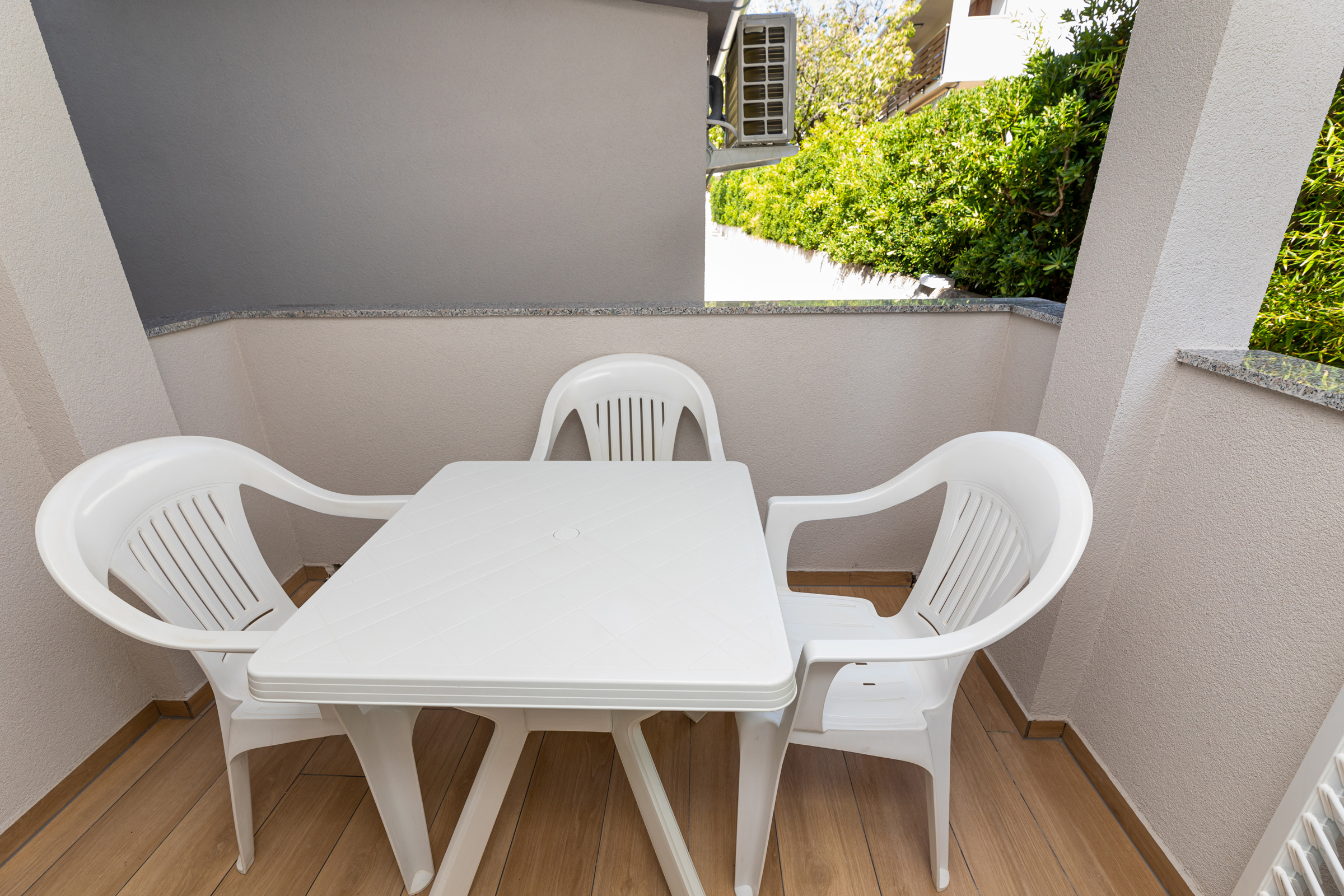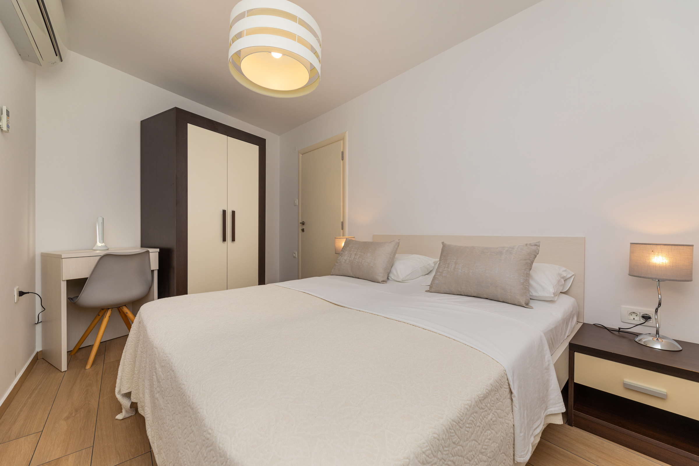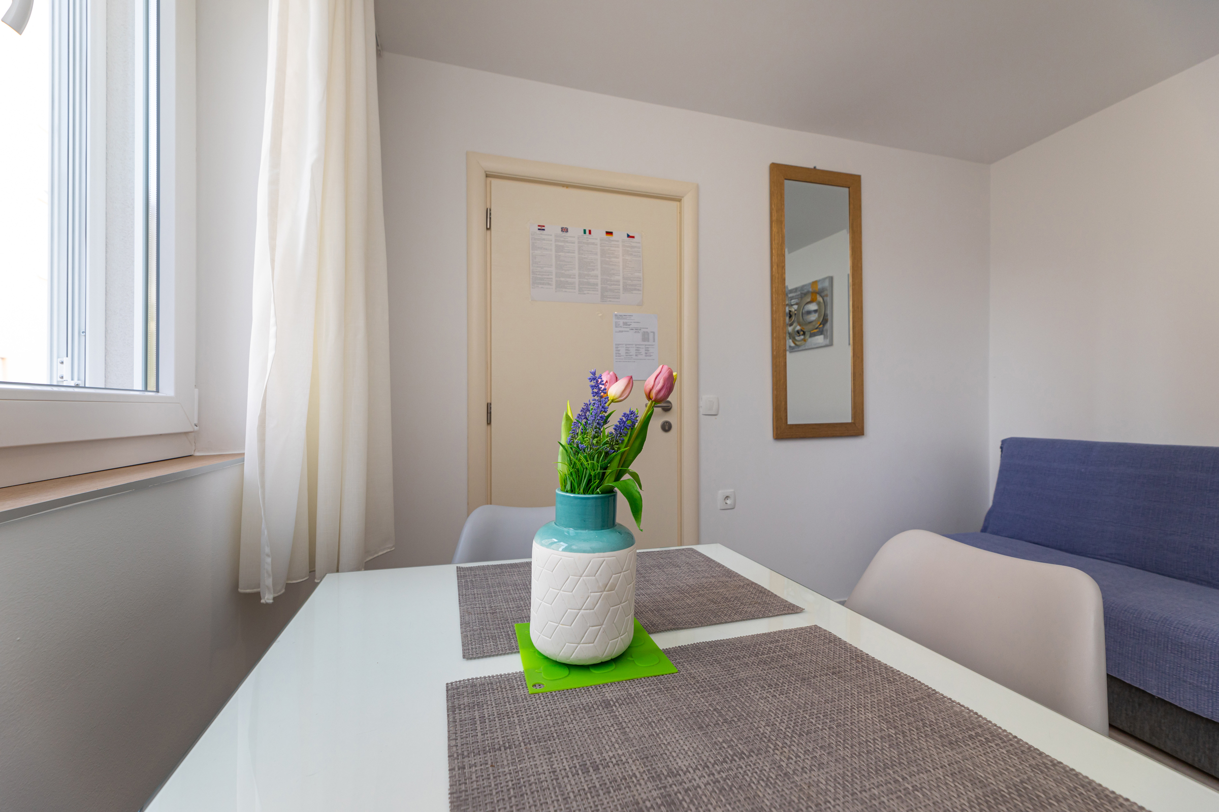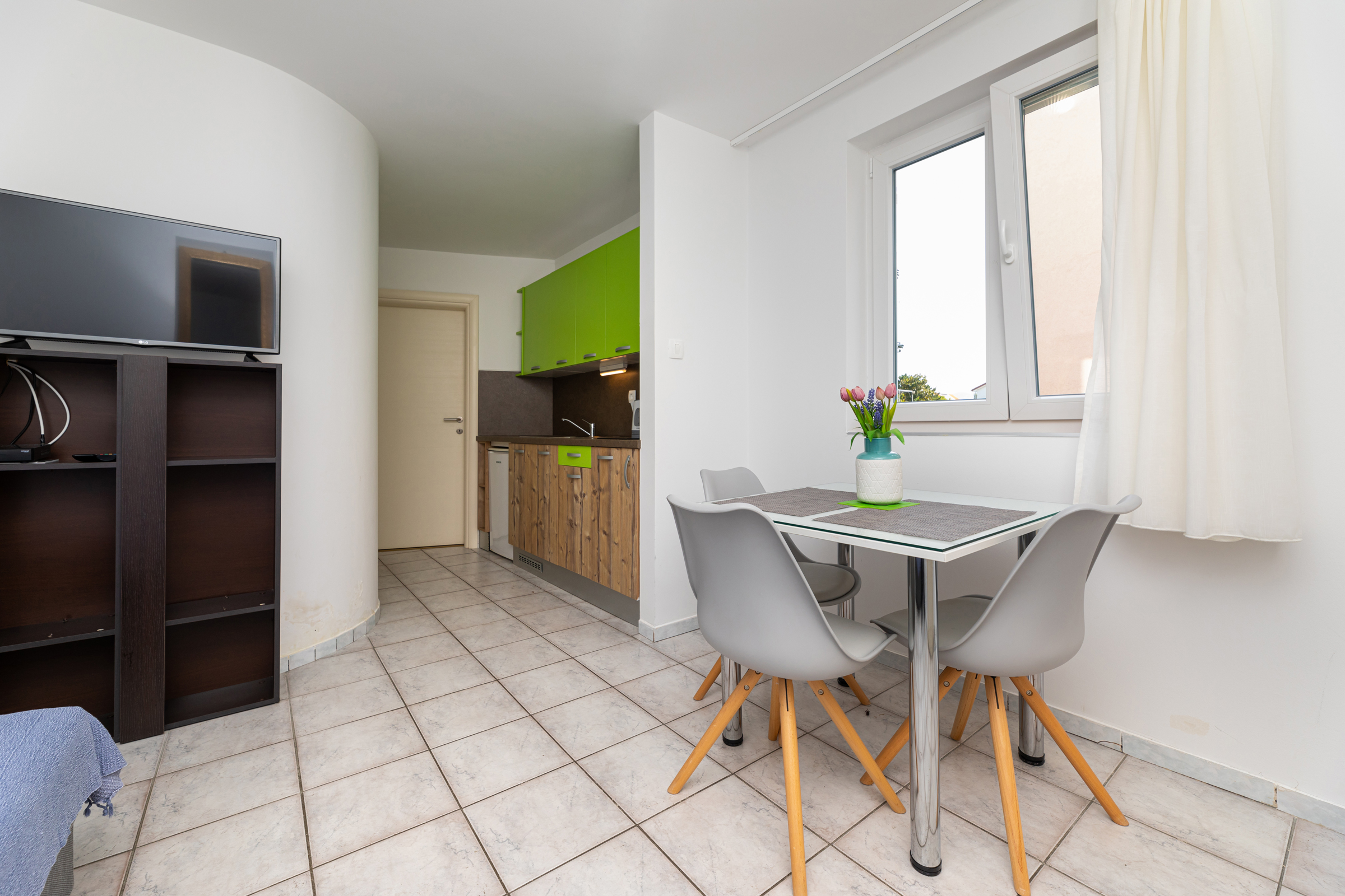Das Haus verfügt über 8 Apartments und 3 Studios, jeweils mit eigenem Parkplatz. 2 Apartments haben 2 Schlafzimmer und Platz für 4 Erwachsene oder eine Familie mit 2-3 Kindern. 6 Apartments haben 1 Schlafzimmer und Platz für zwei Erwachsene und 1 Kind. 3 Studios sind für maximal 2 Personen geeignet. Die Studios Nr. 5 und 6 haben keinen Balkon, Studio 10 hat eigene Balkon. Alle Apartments verfügen über eine Terrasse oder einen Balkon sowie einen Tisch und Stühle.