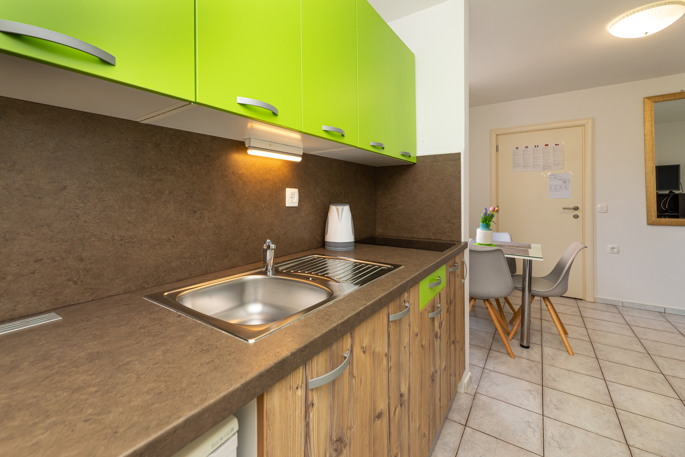 Alle Apartments sind ausgestattet mit: SAT-TV, WIFI, Klimaanlage, Safe. Küche mit Kühl- und Gefrierschrank, Geschirr und Besteck, Wasserkocher, Kaffeemaschine, Induktionsherd oder Glaskeramikkochfeld mit zwei Kochstellen, Mikrowelle. Bad/WC mit Dusche und Haartrockner.