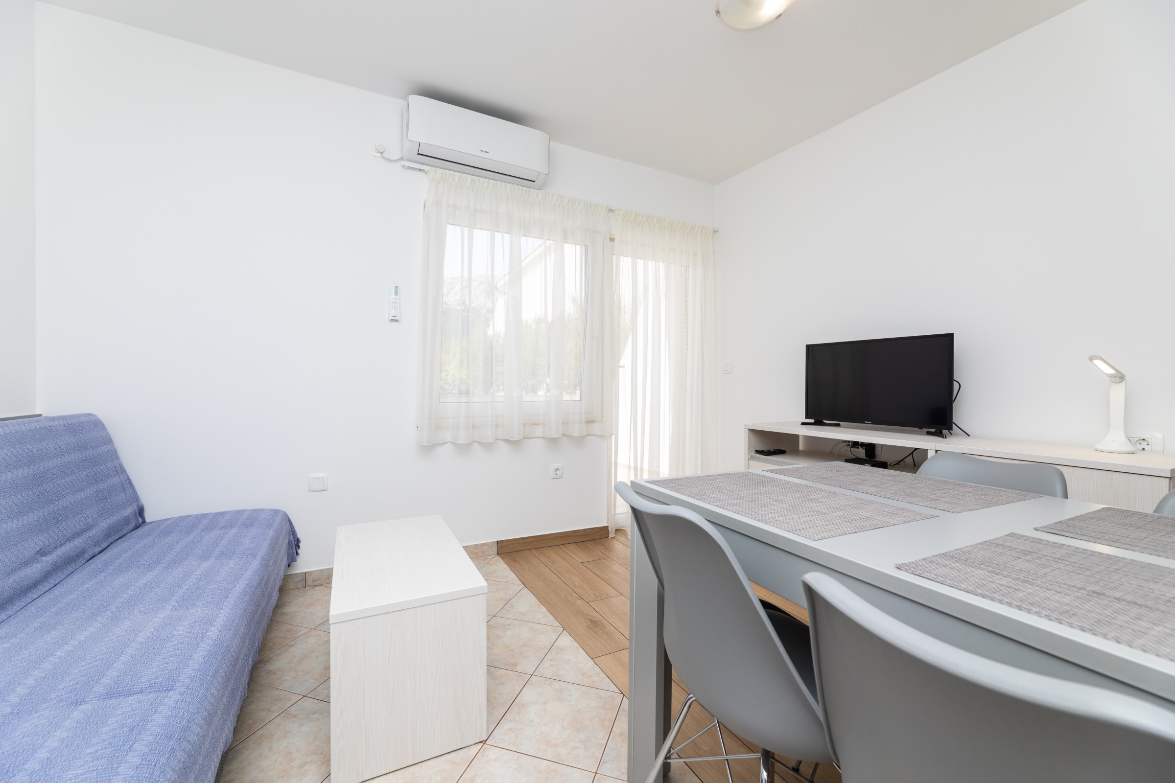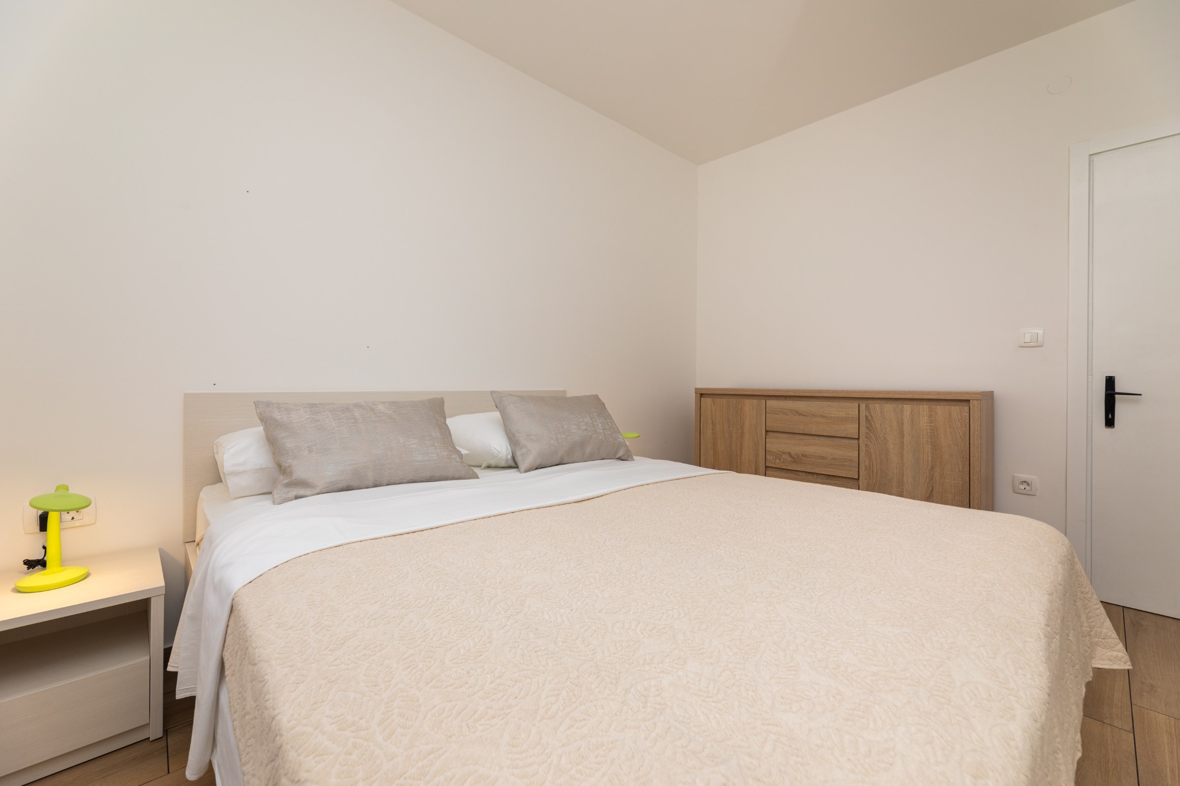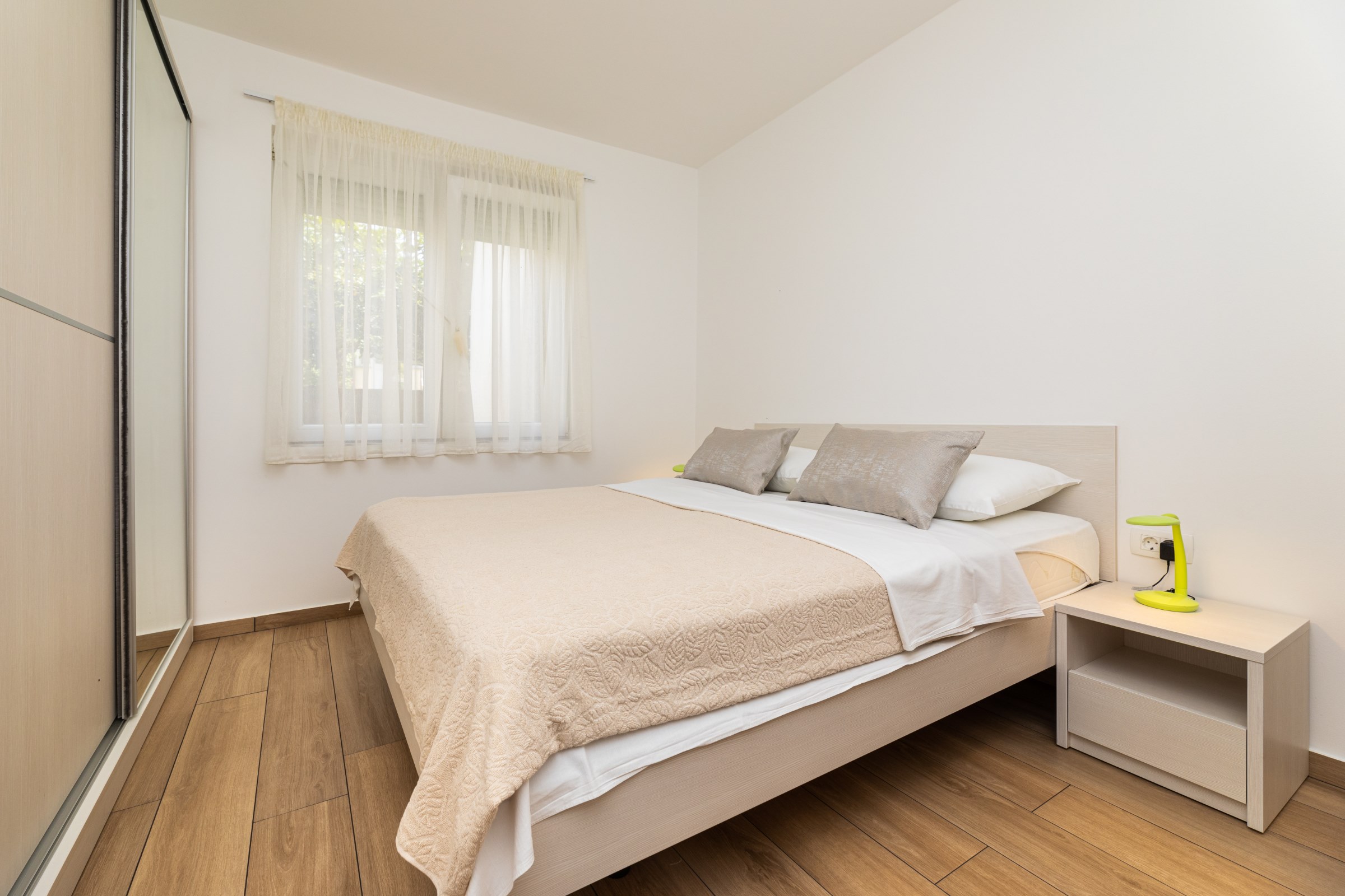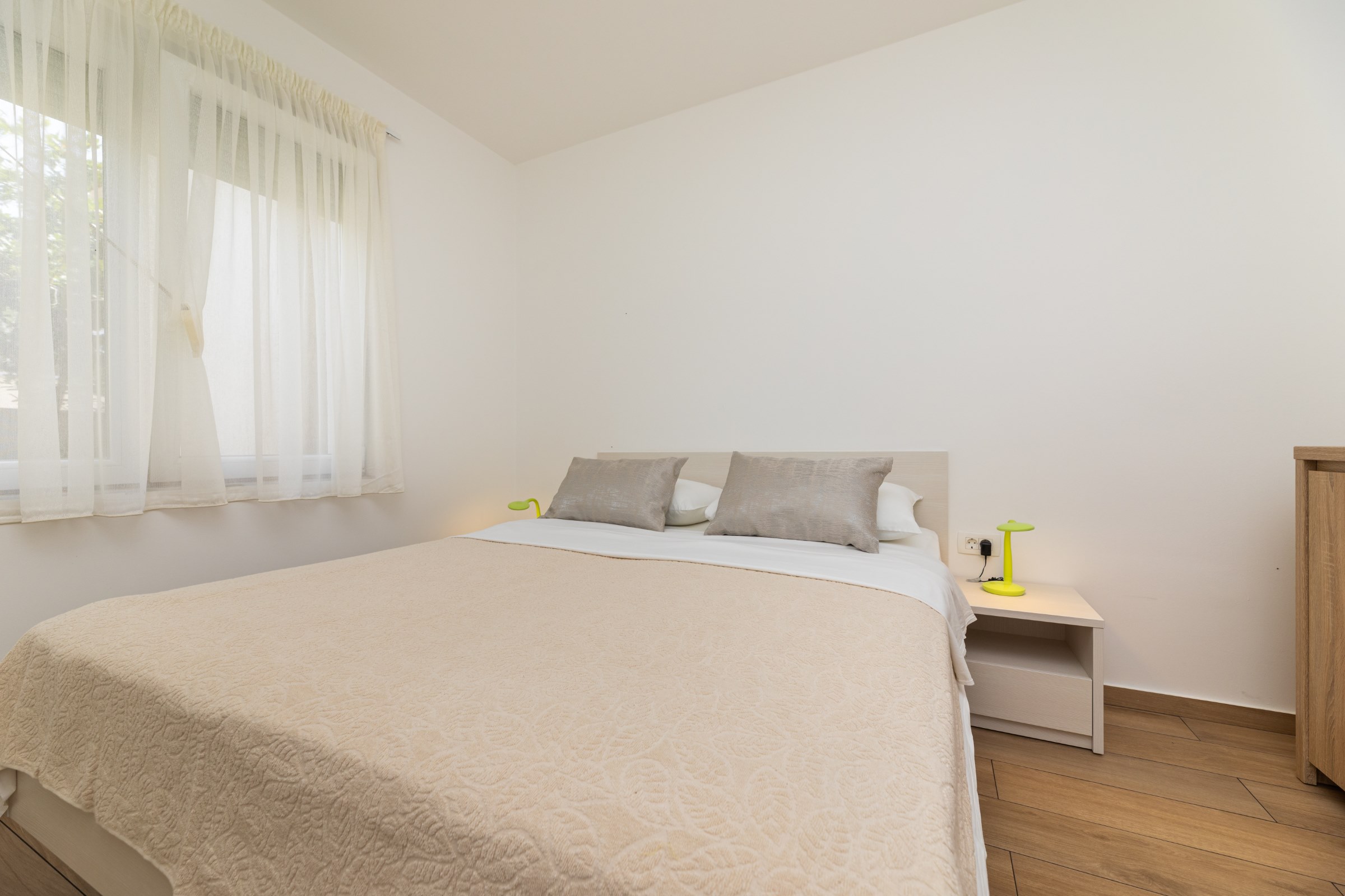 Das Haus verfügt über 8 Apartments und 3 Studios, jeweils mit eigenem Parkplatz. 2 Apartments haben 2 Schlafzimmer und Platz für 4 Erwachsene oder eine Familie mit 2-3 Kindern. 6 Apartments haben 1 Schlafzimmer und Platz für zwei Erwachsene und 1 Kind. 3 Studios sind für maximal 2 Personen geeignet. Die Studios Nr. 5 und 6 haben keinen Balkon, Studio 10 hat eigene Balkon. Alle Apartments verfügen über eine Terrasse oder einen Balkon sowie einen Tisch und Stühle.