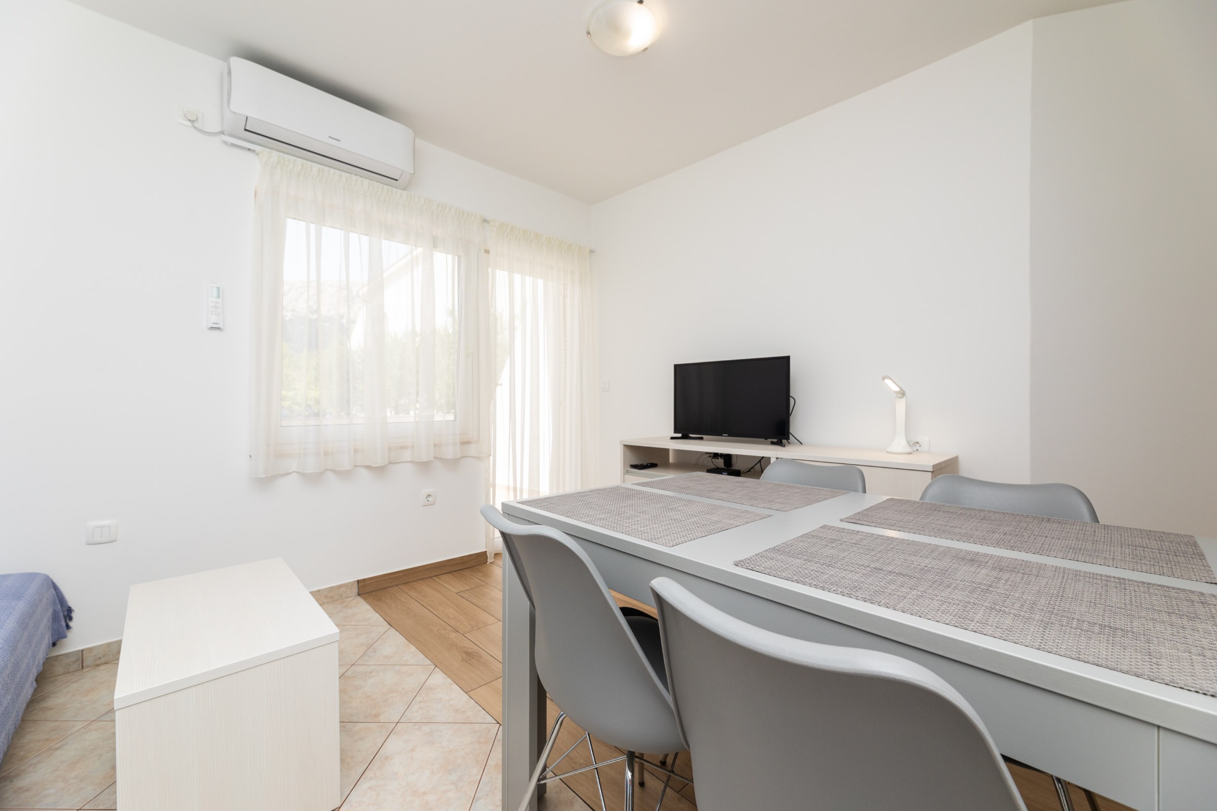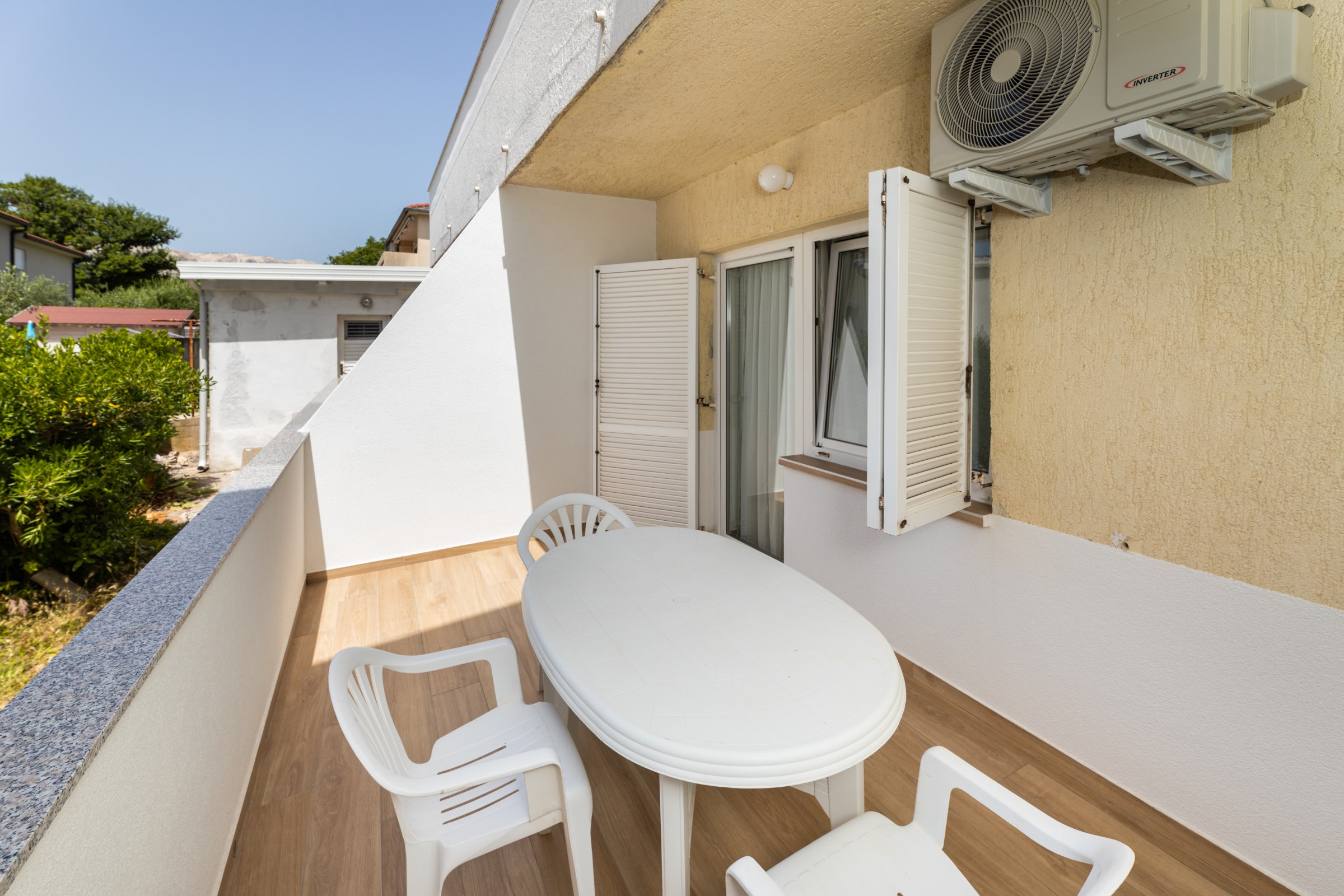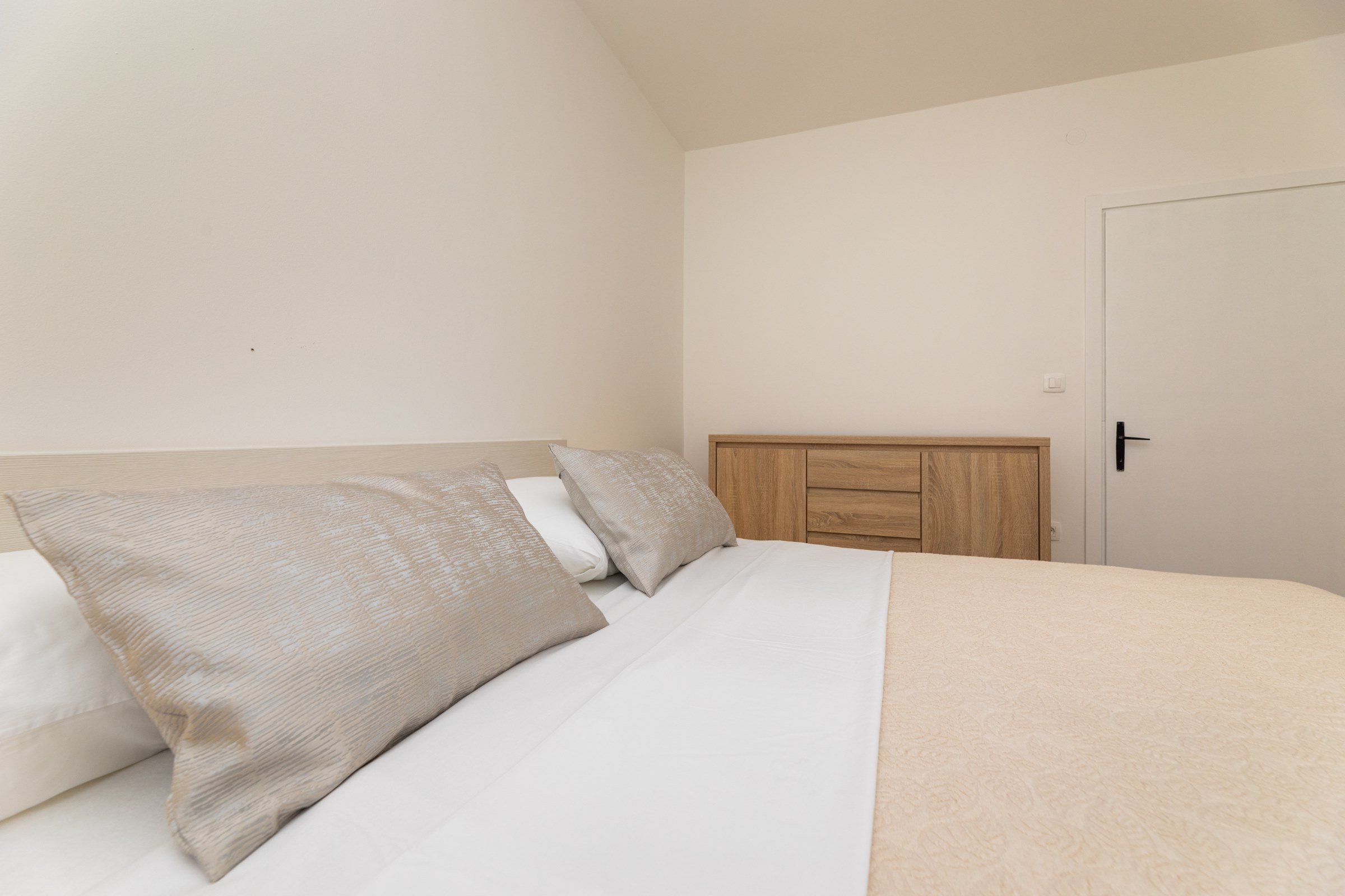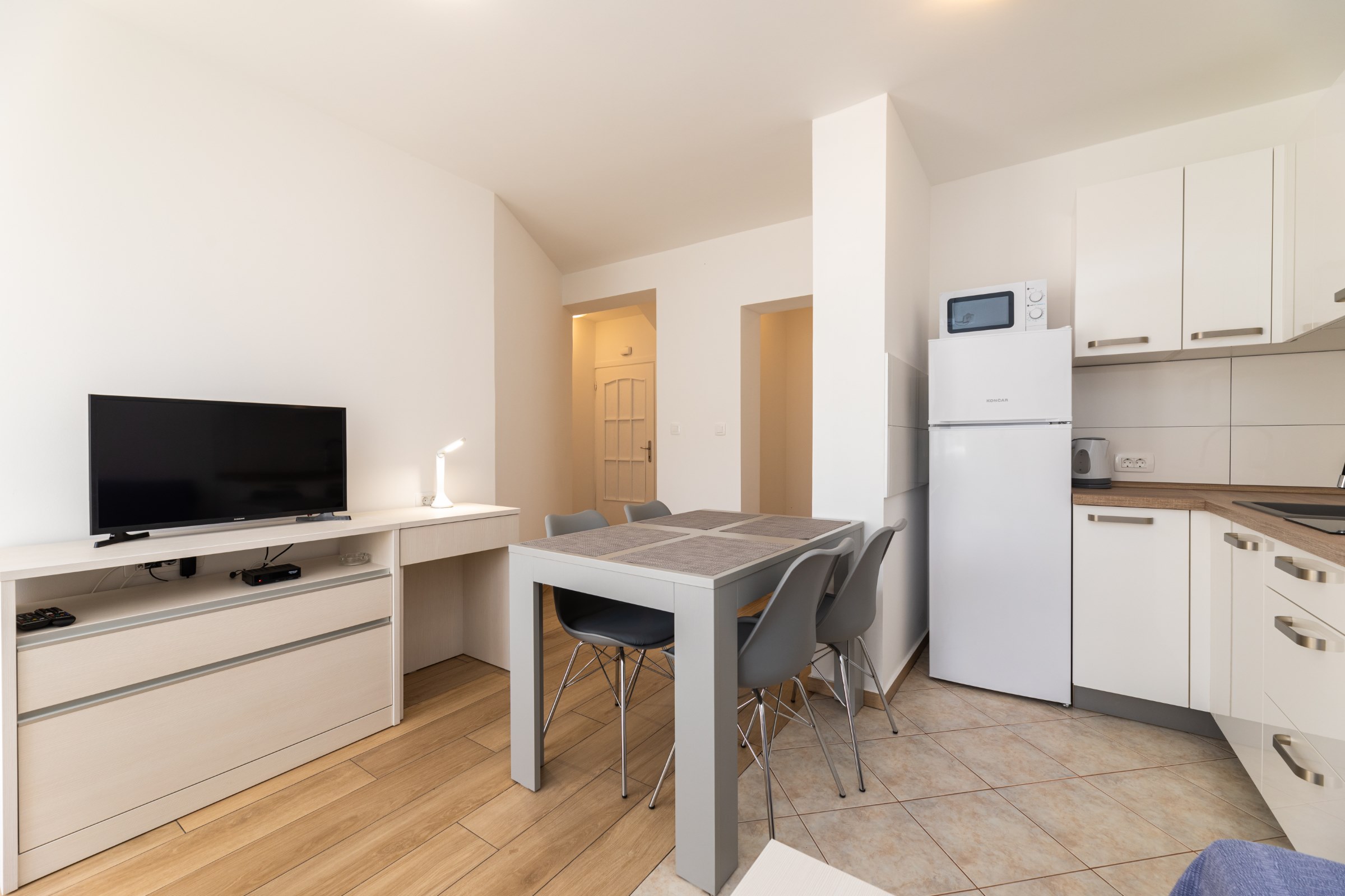 Das Haus verfügt über 8 Apartments und 3 Studios, jeweils mit eigenem Parkplatz. 2 Apartments haben 2 Schlafzimmer und Platz für 4 Erwachsene oder eine Familie mit 2-3 Kindern. 6 Apartments haben 1 Schlafzimmer und Platz für zwei Erwachsene und 1 Kind. 3 Studios sind für maximal 2 Personen geeignet. Die Studios Nr. 5 und 6 haben keinen Balkon, Studio 10 hat eigene Balkon. Alle Apartments verfügen über eine Terrasse oder einen Balkon sowie einen Tisch und Stühle.