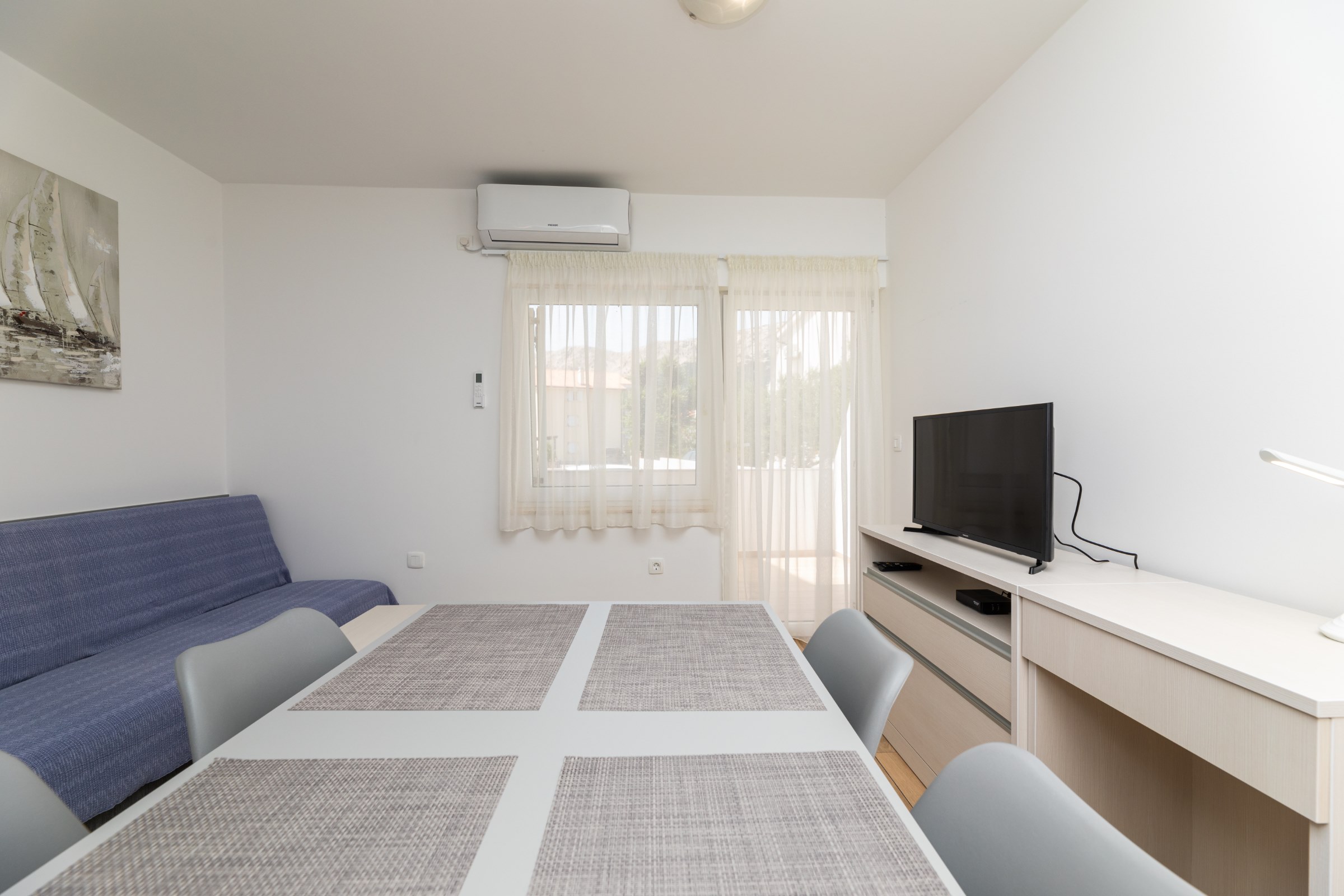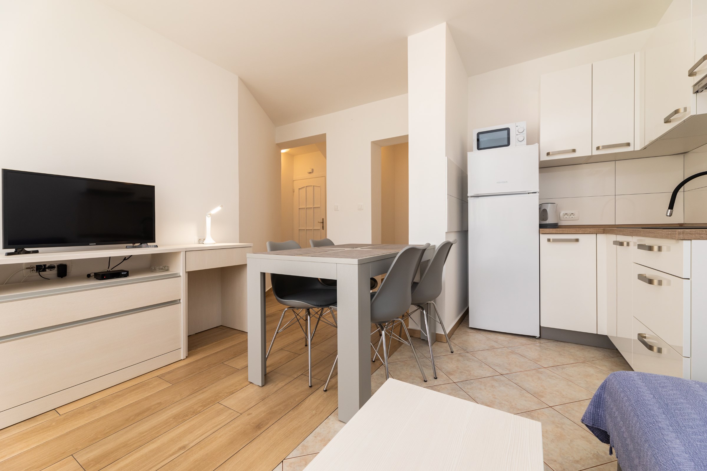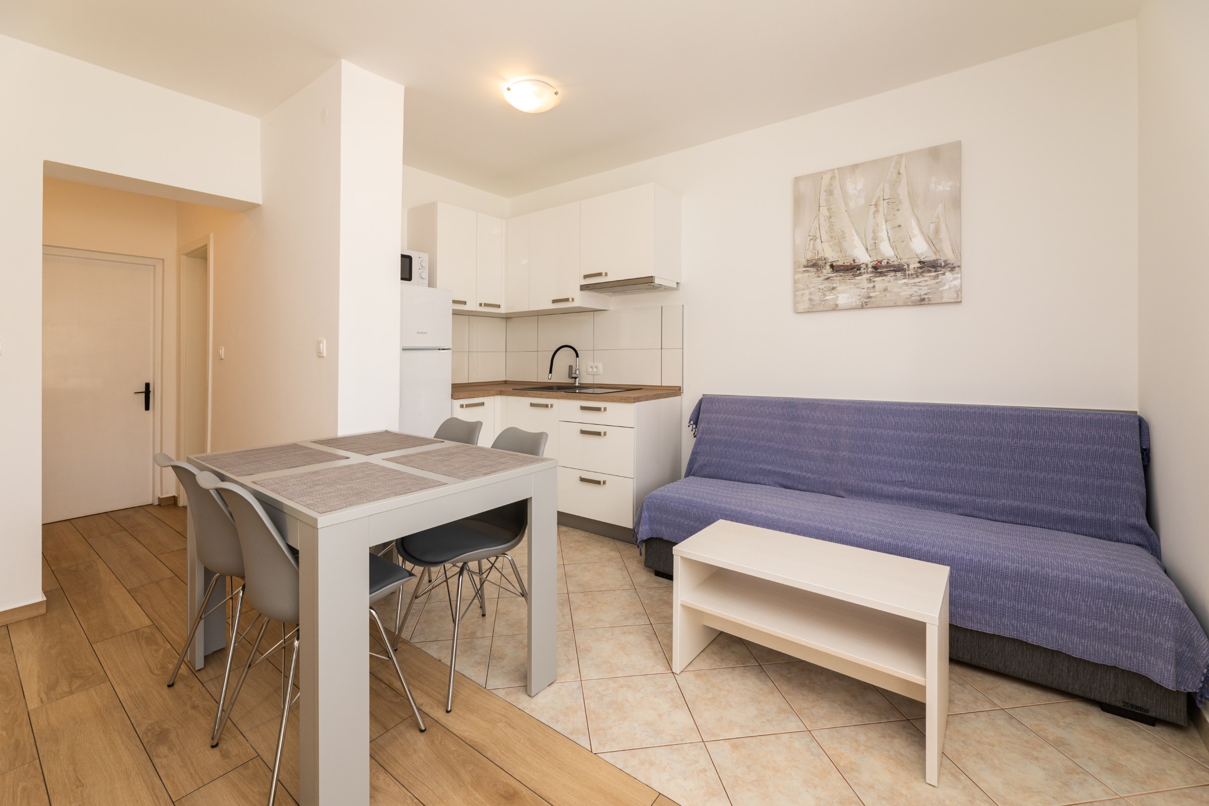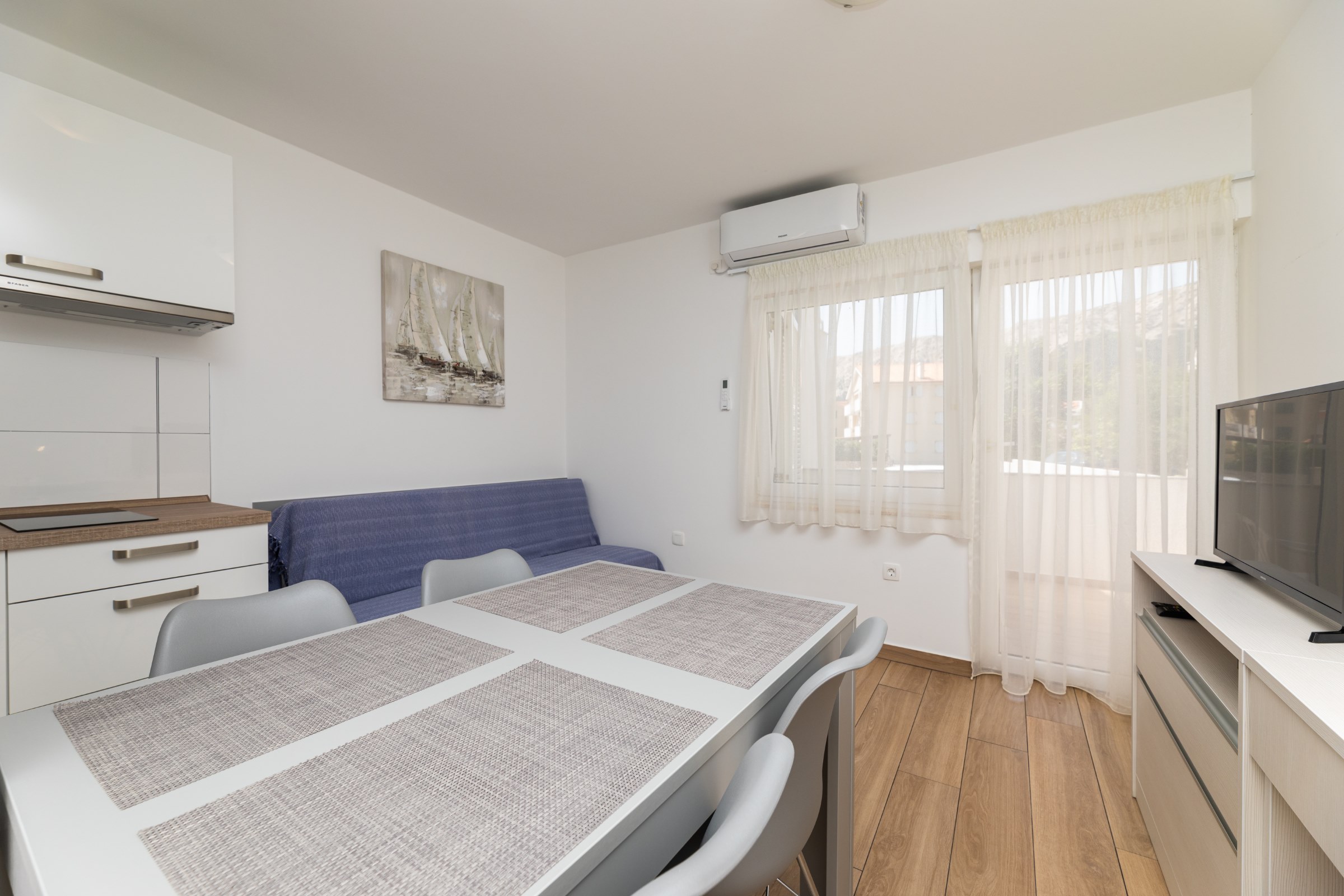 Das Haus verfügt über 8 Apartments und 3 Studios, jeweils mit eigenem Parkplatz. 2 Apartments haben 2 Schlafzimmer und Platz für 4 Erwachsene oder eine Familie mit 2-3 Kindern. 6 Apartments haben 1 Schlafzimmer und Platz für zwei Erwachsene und 1 Kind. 3 Studios sind für maximal 2 Personen geeignet. Die Studios Nr. 5 und 6 haben keinen Balkon, Studio 10 hat eigene Balkon. Alle Apartments verfügen über eine Terrasse oder einen Balkon sowie einen Tisch und Stühle.